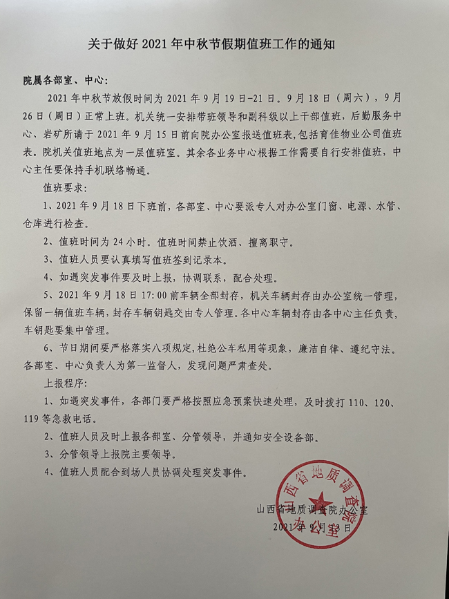 關(guān)于做好2021年中秋節(jié)假期值班工作的通知