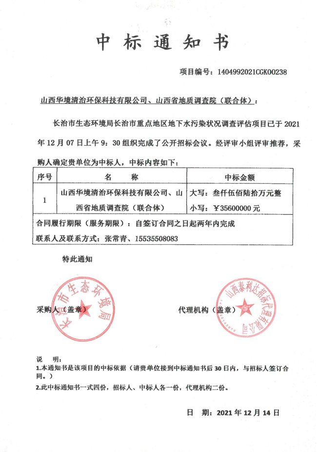 省地調(diào)院與山西華境清治環(huán)??萍加邢薰咀鳛槁?lián)合體于2021年12月7日參加“長治市生態(tài)環(huán)境局長治市重點地區(qū)地下水污染狀況調(diào)查評估”項目公開投標,并成功中標,金額為3560萬元,項目周期2年。