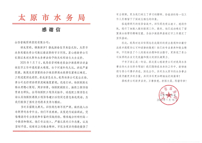 1月16日,山西省地質調查院有限公司收到了來自太原市水務局的感謝信。信中,市水務局對我公司工作人員的敬業(yè)精神和專業(yè)素養(yǎng)給予高度認可和贊賞,并對我公司長期以來對太原市水務事業(yè)的無私幫助與大力支持表達衷心感謝。