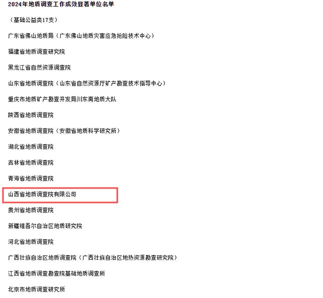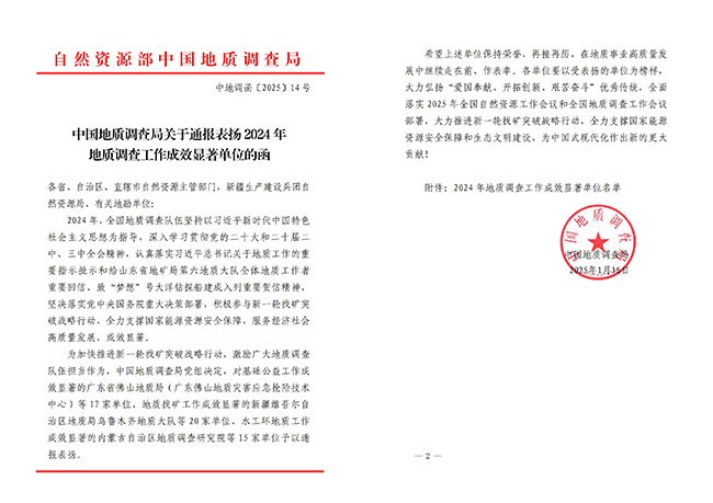 近日,自然資源部中國(guó)地質(zhì)調(diào)查局印發(fā)通知,對(duì)2024年地質(zhì)調(diào)查工作成效顯著單位予以通報(bào)表?yè)P(yáng)。山西省地質(zhì)調(diào)查院有限公司作為山西省唯一一家入選單位,憑借著傳統(tǒng)專業(yè)技術(shù)優(yōu)勢(shì),及在基礎(chǔ)性、公益性地質(zhì)調(diào)查和戰(zhàn)略性礦產(chǎn)勘查評(píng)價(jià)方面的顯著成績(jī),名列基礎(chǔ)公益類2024年地質(zhì)調(diào)查工作成效顯著單位。這項(xiàng)榮譽(yù)是對(duì)我公司地質(zhì)工作的充分肯定和莫大鼓舞!