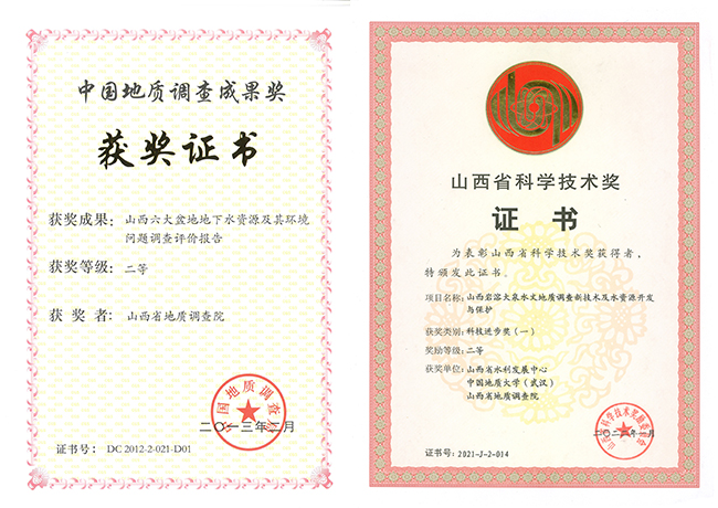 在水文地質(zhì)調(diào)查方面,《西部嚴重缺水地區(qū)人畜飲用地下水勘查示范工程》、《鄂爾多斯盆地地下水勘查》項目獲國土資源科學技術(shù)一等獎,《山西六大盆地地下水資源及其環(huán)境問題調(diào)查》評價項目獲國土資源科學技術(shù)獎二等獎和中國地質(zhì)調(diào)查成果獎,《黃河中下游主要環(huán)境地質(zhì)問題調(diào)查評價》項目獲中國地質(zhì)調(diào)查成果,《山西巖溶大泉水文地質(zhì)調(diào)查新技術(shù)及水資源開發(fā)利用與保護》項目獲2021年度山西省科學技術(shù)二等獎。2023年新開展《山西省岢嵐縣飲水解困1:5萬水文地質(zhì)調(diào)查》工作,提高區(qū)域水文地質(zhì)調(diào)查精度,為區(qū)域發(fā)展提供水源保障。